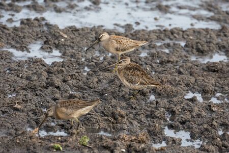 A flock of Long-billed dowitchers making a landing. Vancouver BC Canada