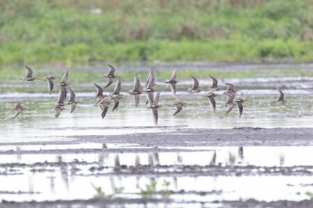 flying long billed dowitcher at Vancouver wet land , BC Canada