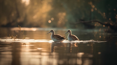 Ringed sandpiper, Tringa totanus, pair of birds swimming in a lake at sunset