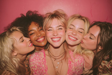 Five women of different ethnicities are smiling and enjoying each other's company, creating a lively atmosphere of friendship and joy in a colorful setting
