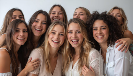 A diverse group of happy women smiling together, exuding joy and camaraderie in a close-knit setting.