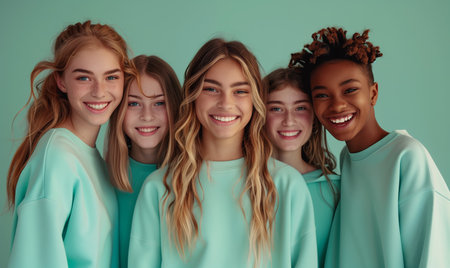 Group of interracial happy teenage school boys and girls in monotone sweatshirts on mint background