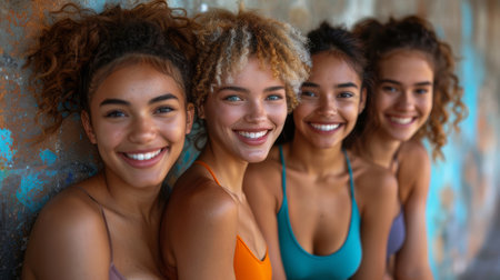 Group of laughing young women in sportswear leaning against a wall outdoors, showcasing fitness, friendship, and joy on a sunny day.