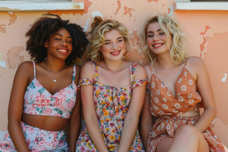 Close-up image showcasing three young women from different ethnic backgrounds sharing a light-hearted moment. Their genuine smiles and casual summer outfits enhance the feeling of joy and friendship.