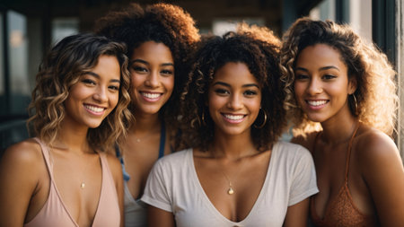 A joyful group of diverse young women laughing together in warm golden sunlight, radiating friendship and happiness.