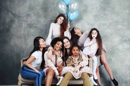 Lifestyle and people concept: young pretty diversity nations woman with different age children celebrating on birth day party together happy smiling, making selfie. African-american, asian and caucasian
