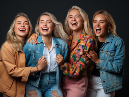 A group of young women, best friends, sharing a joyful moment as they laugh together. Their faces are filled with happiness and camaraderie, showcasing the strong bond between them.