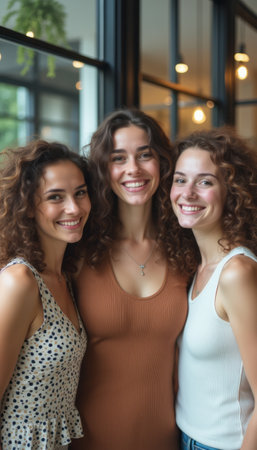 The image captures three vibrant women with curly hair, radiating happiness as they pose together in a stylish café setting. Their warm smiles and close friendship create an inviting atmosphere, showcasing the joy of connection and shared moments