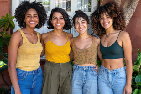 Friendship Day, a worldwide celebration of human connection. A group of diverse young women, standing together in outdoor setting smiling at camera. They appear happy