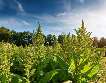 tobacco plants on the field with blue sky in the background