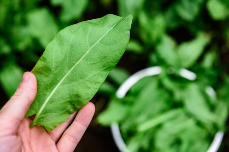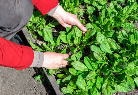The gardener collects fresh sorrel leaves in the garden. The first spring vegetable harvest