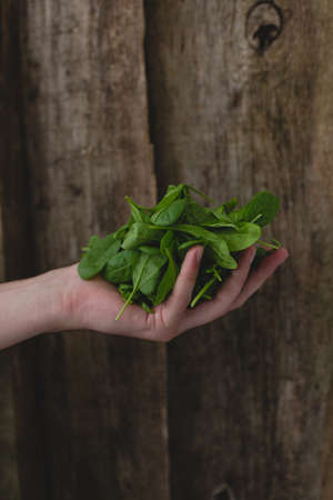 Fresh Baby Spinach on a rustic wooden board, top view. Overhead, from above, flat lay.