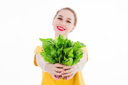Portrait of a beautiful, slender girl with a salad in her hands.