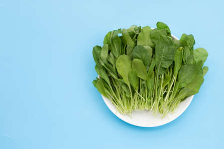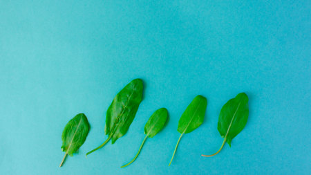 Fresh green leaves of sorrel in a row on turquoise background. Minimal vegan diet concept.