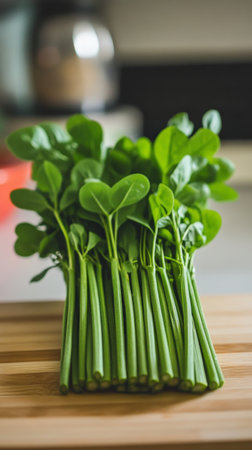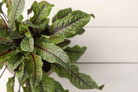 fresh ripe green sorrel on wooden background in studio