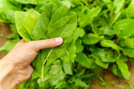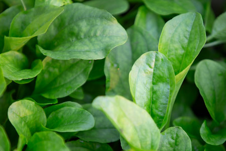 Close up of fresh green spinach leaves in the garden, selective focus