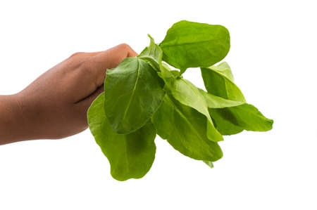 Close up of hand holding spinach at home on white background - Healthy Eating, Dieting, Vegetarian Food and People concept.