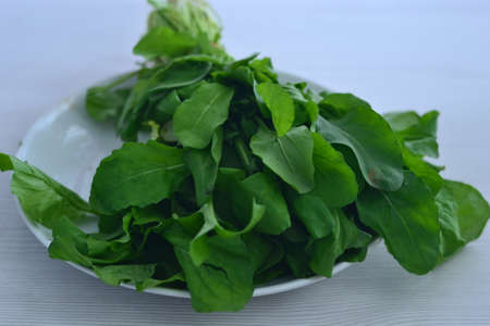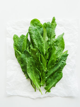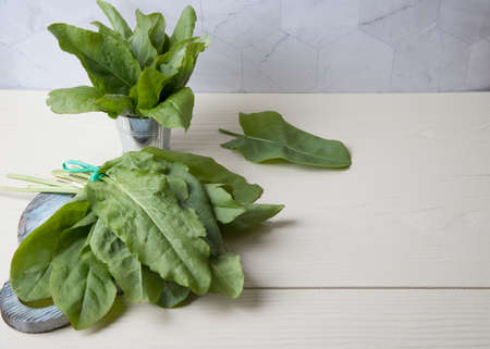 A bunch of leaves of garden sorrel spinach on a light background. The first spring vitamins