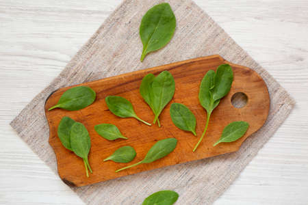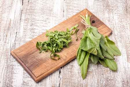 fresh sorrel leaves on cutting board on oak wood table, rustic food