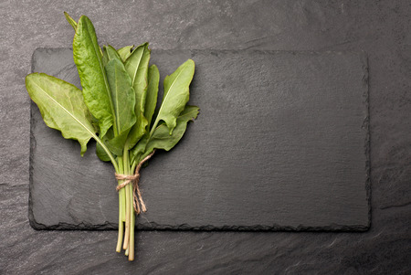 Fresh sorrel on a black stone graphit table. Food vegetable