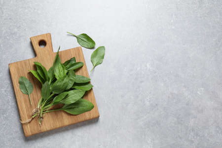 Fresh green sorrel leaves on light gray table, top view. Space for text