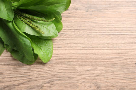 Green broadleaf plantain leaves on wooden table, top view. Space for text