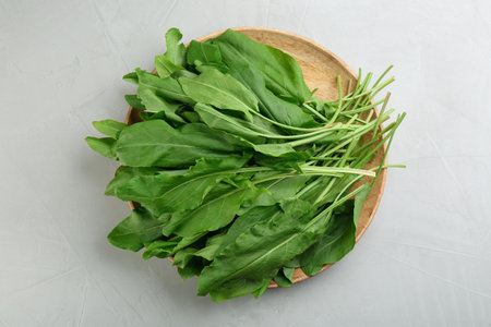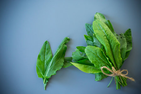 Green sorrel leaves for healthy eating on gray background.
