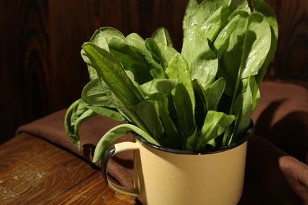 Green sorrel leaves on wooden table