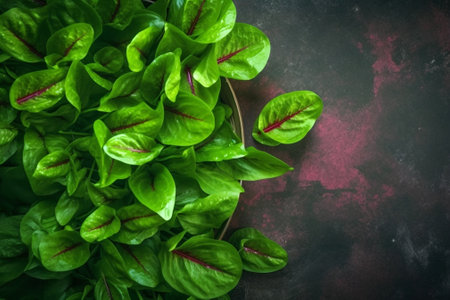 Bunch of sorrel on dark grey background, top view. Space for text