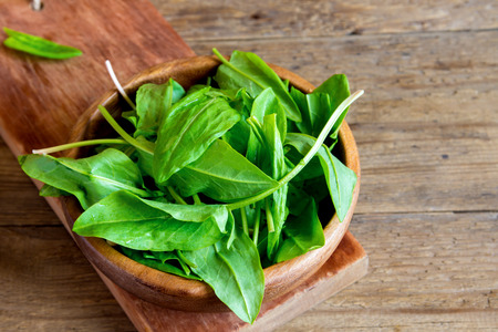 fresh organic sorrel leaves in wooden bowl