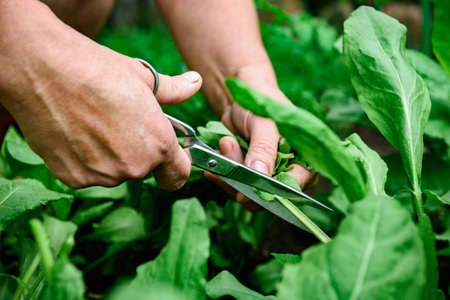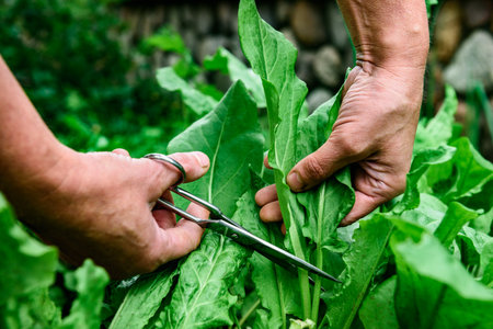 A woman picking fresh green sorrel growing in a garden using scissors.