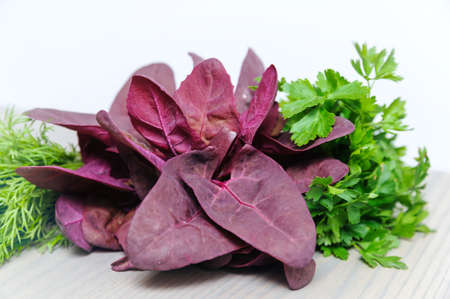 Red spinach, parsley and dill are on a wooden background.