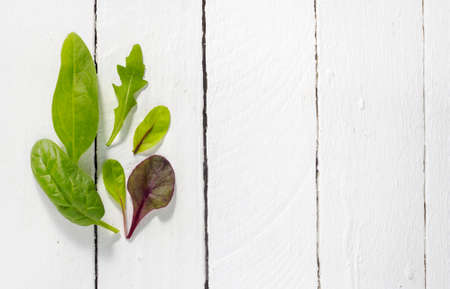 lettuce leaves with spinach, chard and arugula on a white background of boards. A flat surface with a copy of the space