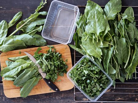 Harvesting sorrel for the winter.Young sorrel leaves are finely chopped on a wooden kitchen Board, put in a container and in the freezer. Dark wooden table.