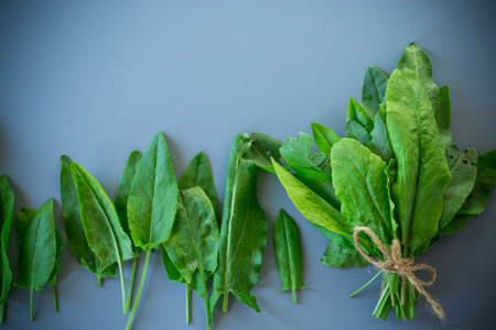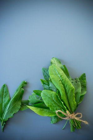 Healthy bunch of sorrel for summer dishes on gray background.