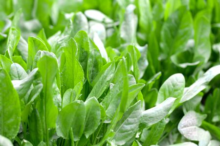 Fresh organic sorrel leaves pattern background for salad or soup. Green sour sorrel foliage texture source of folic acid