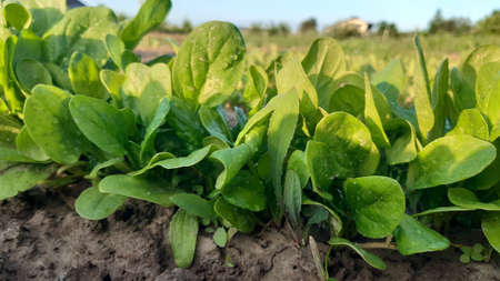 Spinach growing in garden. Fresh natural leaves of spinach growing Bio spanach.