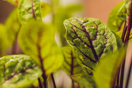 Red beetroot, fresh sprouts and young leaves front view . Vegetable, herb and microgreen. Also beet, table, garden or red beet. Macro photo with water drops.