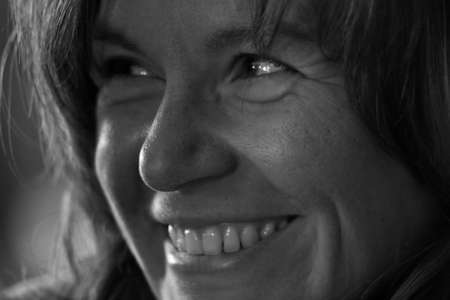A woman is depicted smiling, illuminated by sunlight. The portrait highlights her facial expression and natural skin tone. The lighting creates shadows on a neutral background. This image could be utilized for various commercial purposes, including advertising and editorial content.