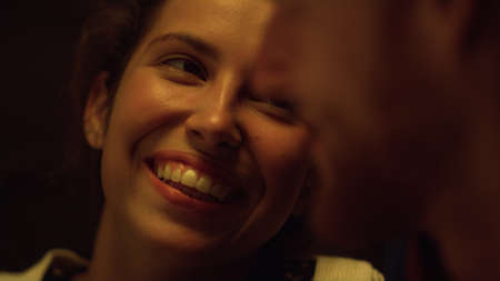 Closeup woman face laugh on evening party. Smiling affectionate couple have fun on night date. Happy boyfriend girlfriend flirt together on valentines holiday. Lovers feel joy indoors. Love concept.