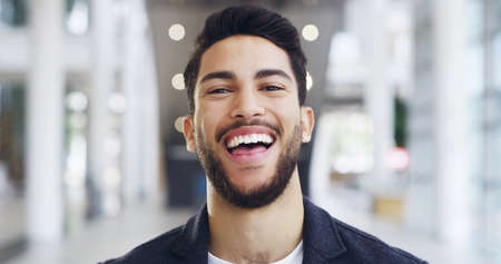 Portrait of happy Caucasian 30s young adult man with a big smile looking at the camera.