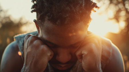 A man lifts his head from his hands, bathed in warm sunlight, reflecting on overcoming stress and finding hope in a serene environment.