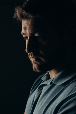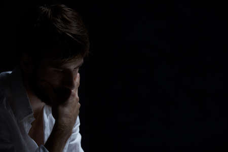 Close-up of young depressed man sitting alone in the darkness