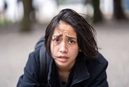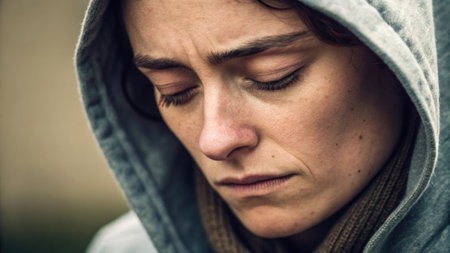 An intense close-up portrait of a young woman's face, filled with despair and sadness as a tear rolls down her cheek. The powerful emotion in her eyes conveys concepts of grief, fear, anxiety, and vulnerability.