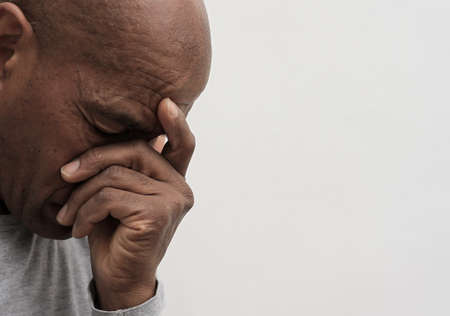 beaten man of color with fist in his face looking down white background - waist up shot. High-quality photo