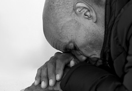 An intimate portrait that captures a moment of deep reflection. The subjects eyes are closed tightly suggesting inner turmoil. The furrowed brow and the tensed mouth reveal.