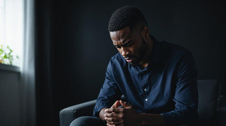 Thoughtful man sitting alone in a dark room contemplating life.