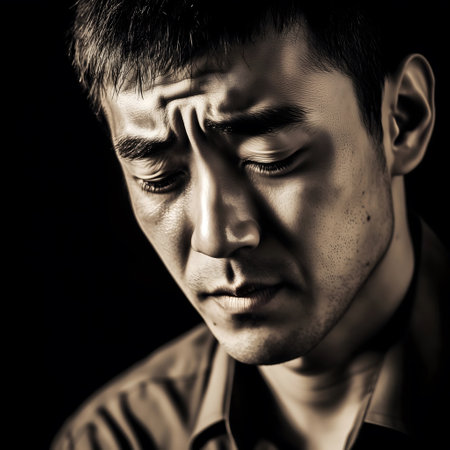 Man covering his face, symbolizing sorrow and regret in a dark setting.
