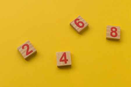 Wooden block with number two, four, six and eight on yellow background.