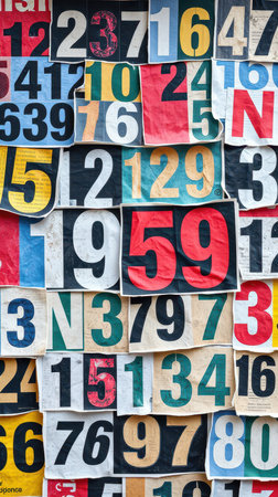 Colorful display of vintage numbers arranged artistically on a wall in an urban setting during daylight